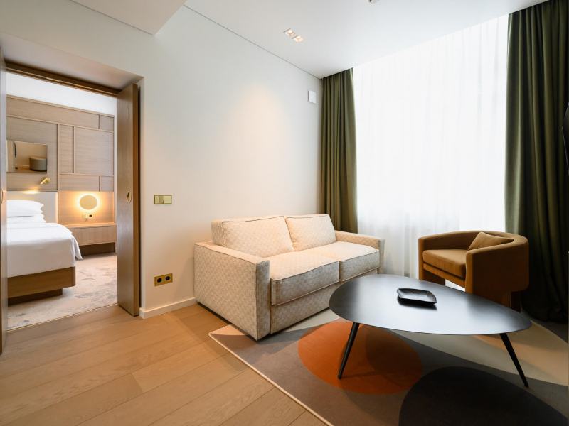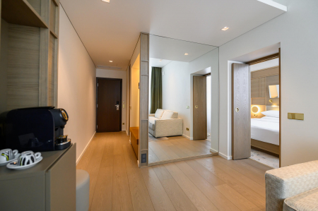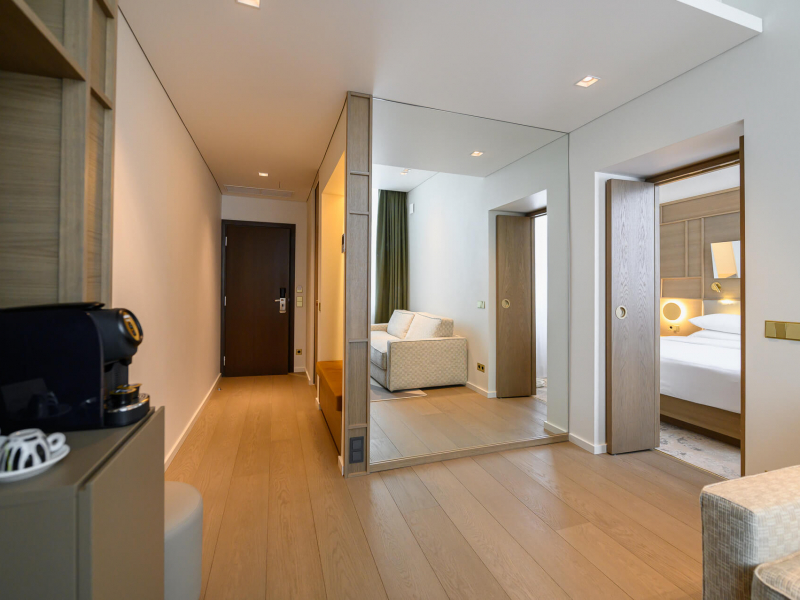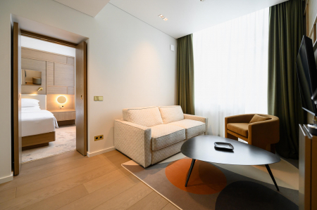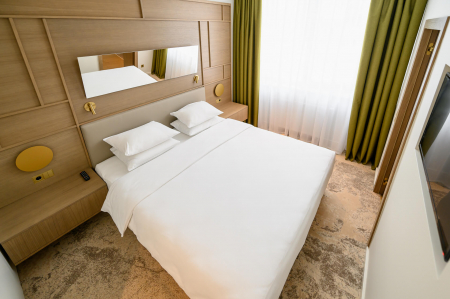 Modernus kambarys – tai erdvė, kurioje šiuolaikinis dizainas ir technologijos susilieja su jaukumu bei komfortu. Įžengus į vonios kambarį Jus pasitiks automatiškai įsižiebianti šviesa ir šildomas veidrodis grožio ritualams. Prie lovos rasite patogiai įrengtas USB-C jungtis įrenginių įkrovimui, o kambaryje – išmanųjį televizorių, kuris po išsiregistravimo automatiškai atjungia visas asmenines paskyras. Automatinė klimato kontrolė palaiko idealią kambario temperatūrą viso poilsio metu. Tobulam miegui čia laukia 7 komforto zonų vidutinio kietumo čiužinys ir aukščiausios kokybės mako satino (Egipto medvilnės) patalynė, apgaubianti švelnumu ir prabanga.